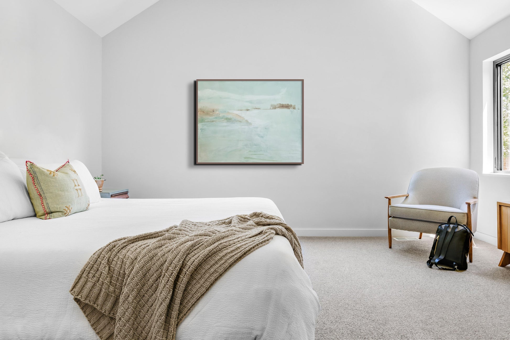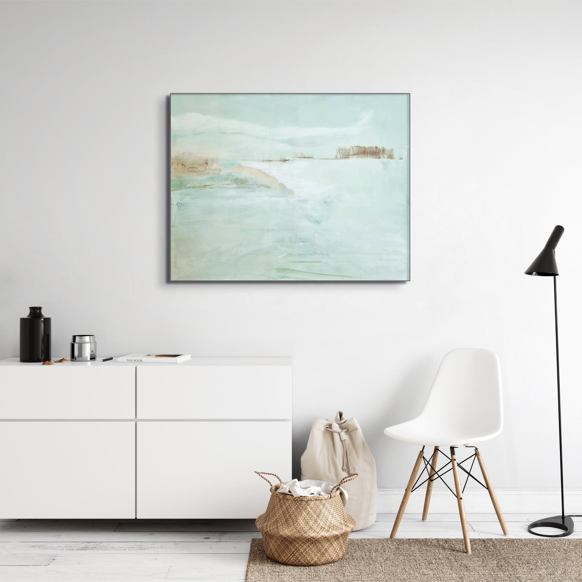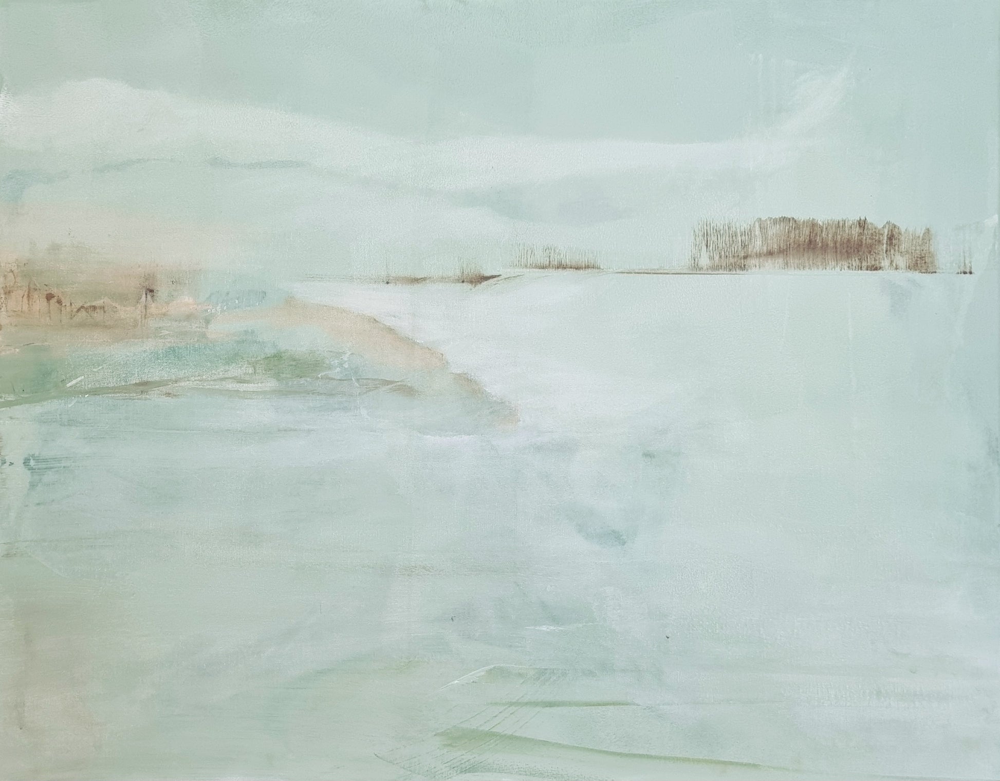 Veidojot šo darbu, es centos apvienot jūras un debesu mieru. Mierīgs, daļēji abstrakts horizonts, kur klusinātie toņi un plūstošie triepieni rada mierīgu un bezgalīgu iespēju sajūtu. Šī glezna ir rāma atkāpšanās vieta, aicinot pārdomas un mieru jebkurā telpā.