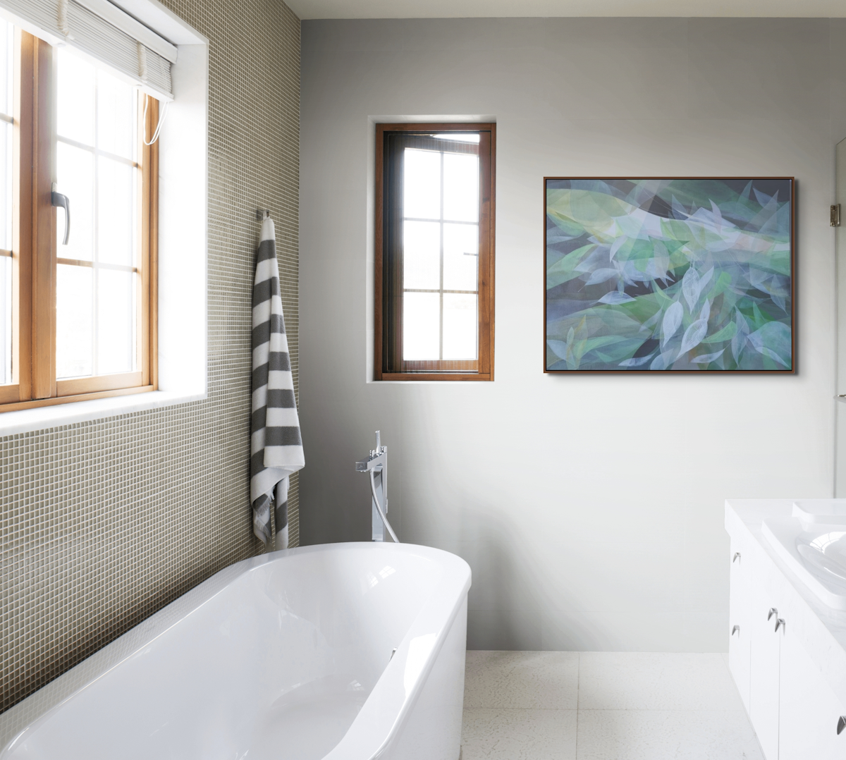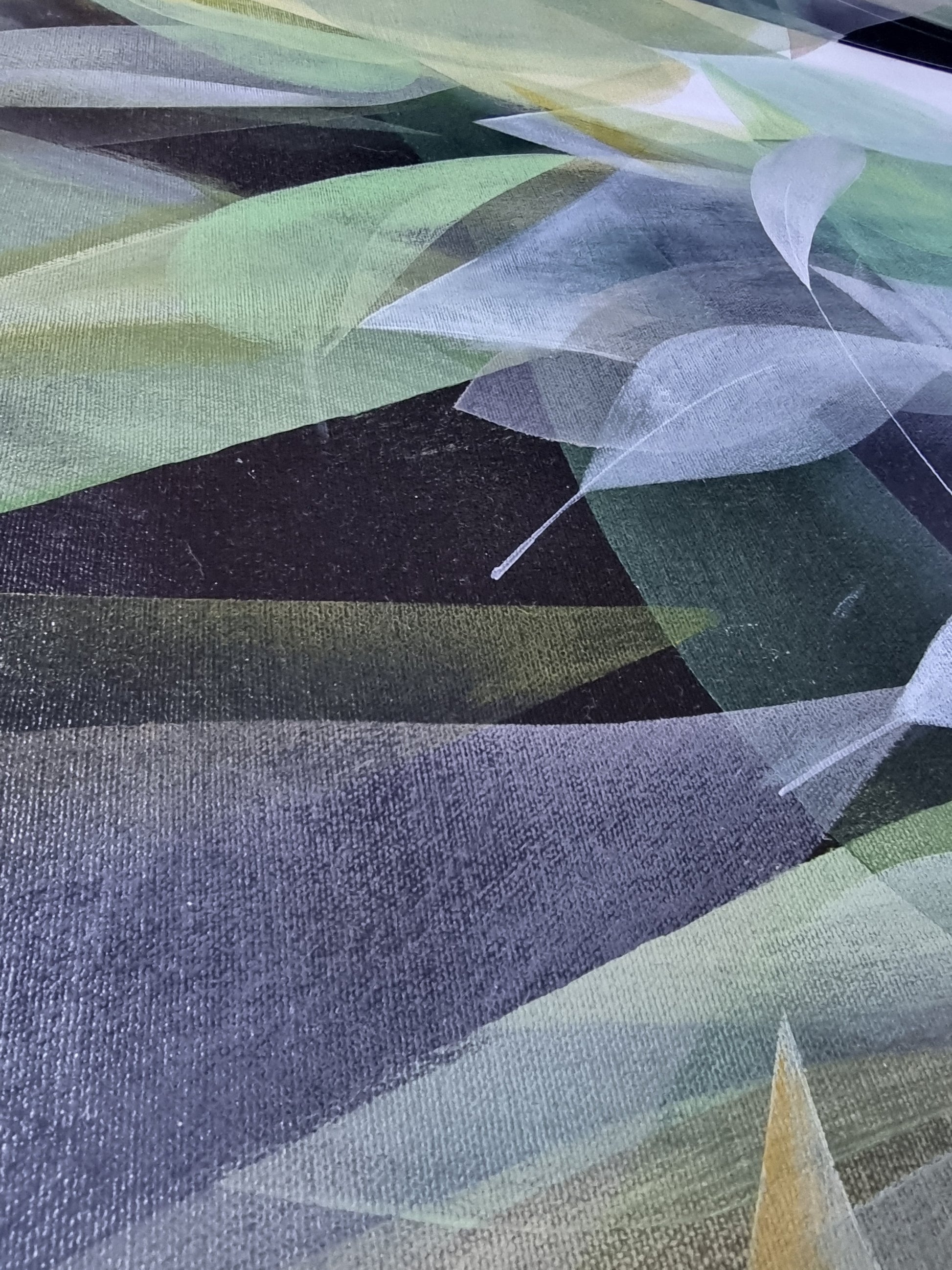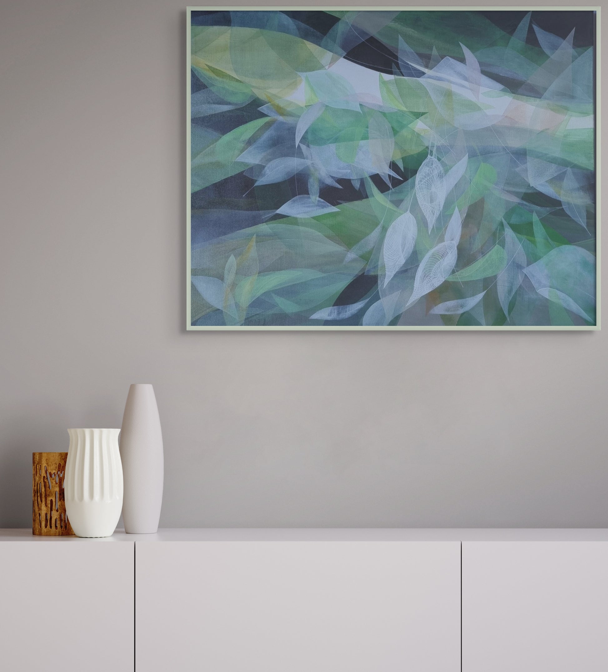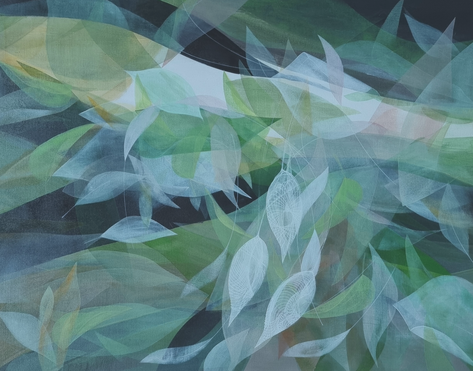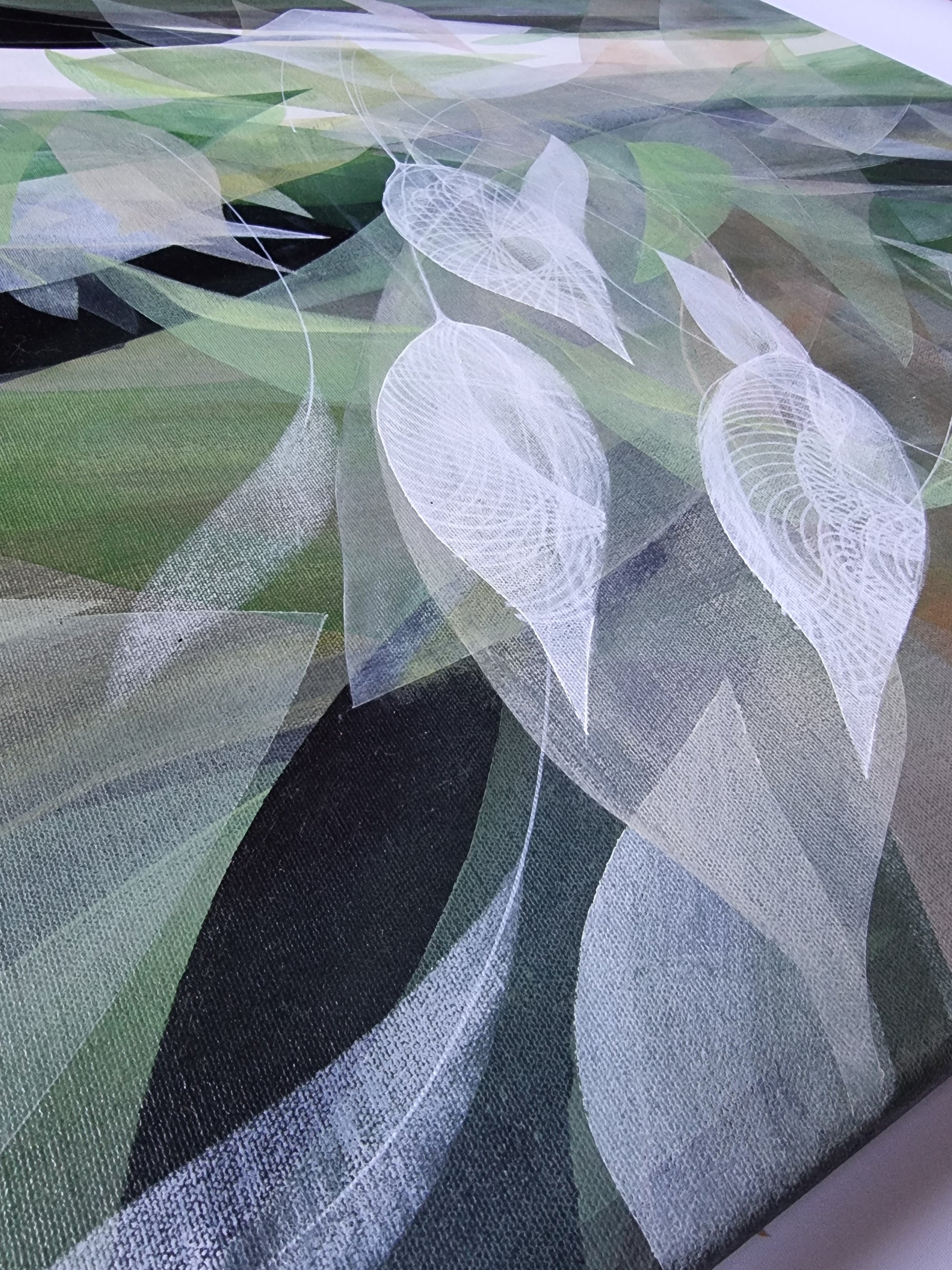 Akrila glezna uz audekla, kurā attēlotas vieglas, caurspīdīgas lapas dabīgās, maigās krāsās. Biophilic māksla, kas iedvesmojas no dabas trausluma un klusā skaistuma.