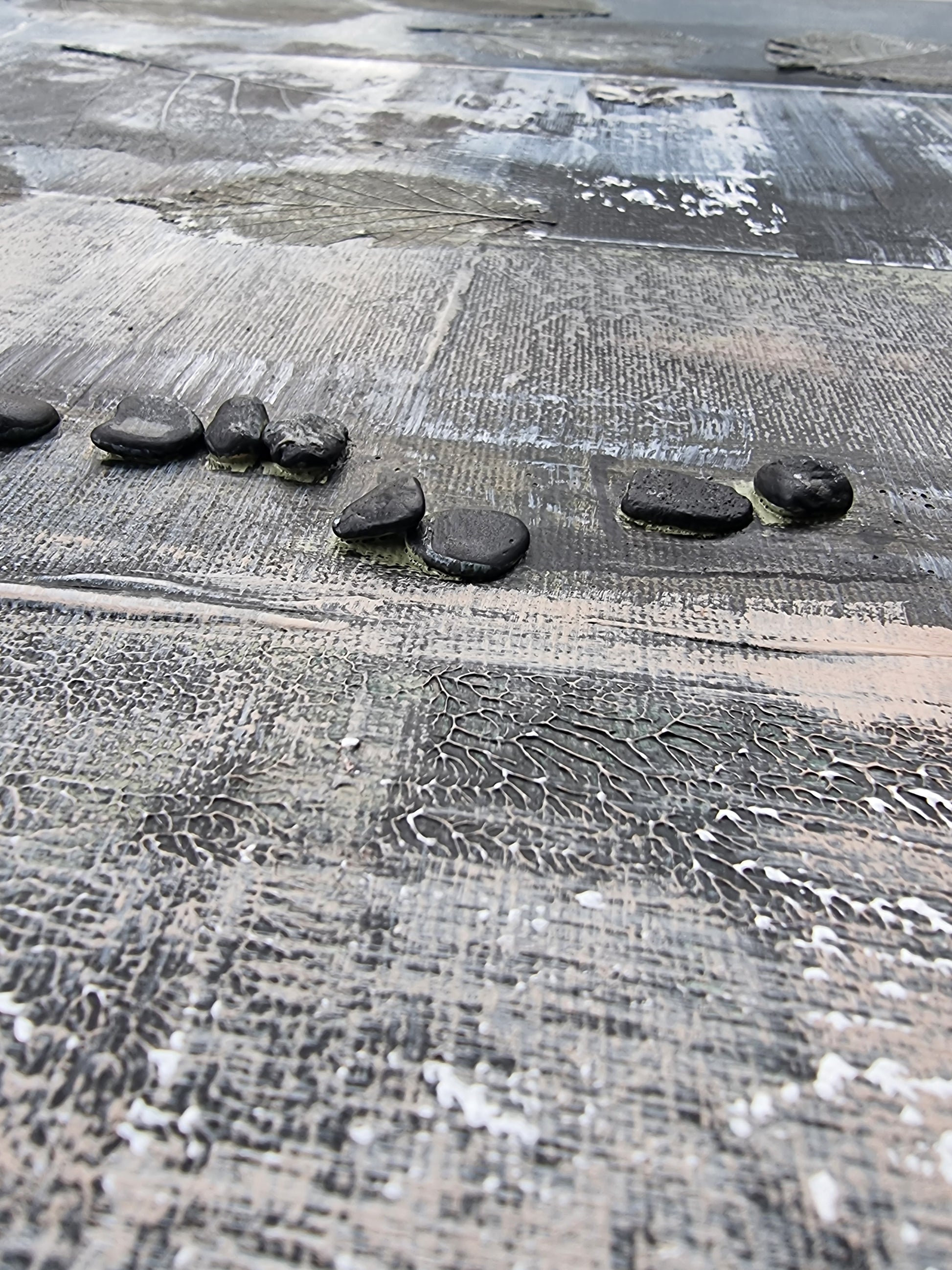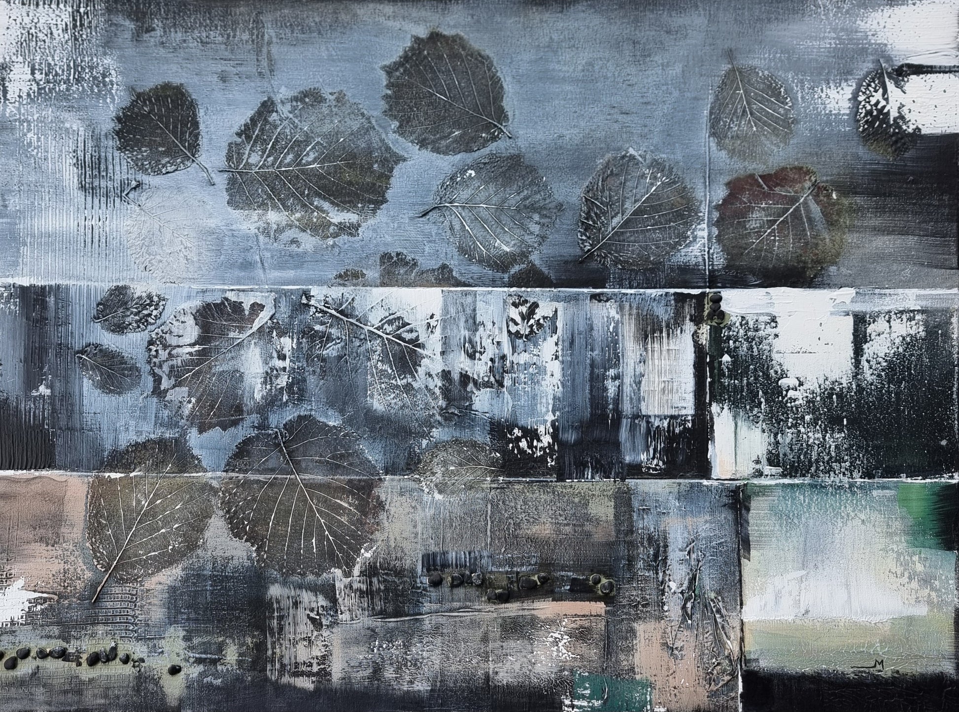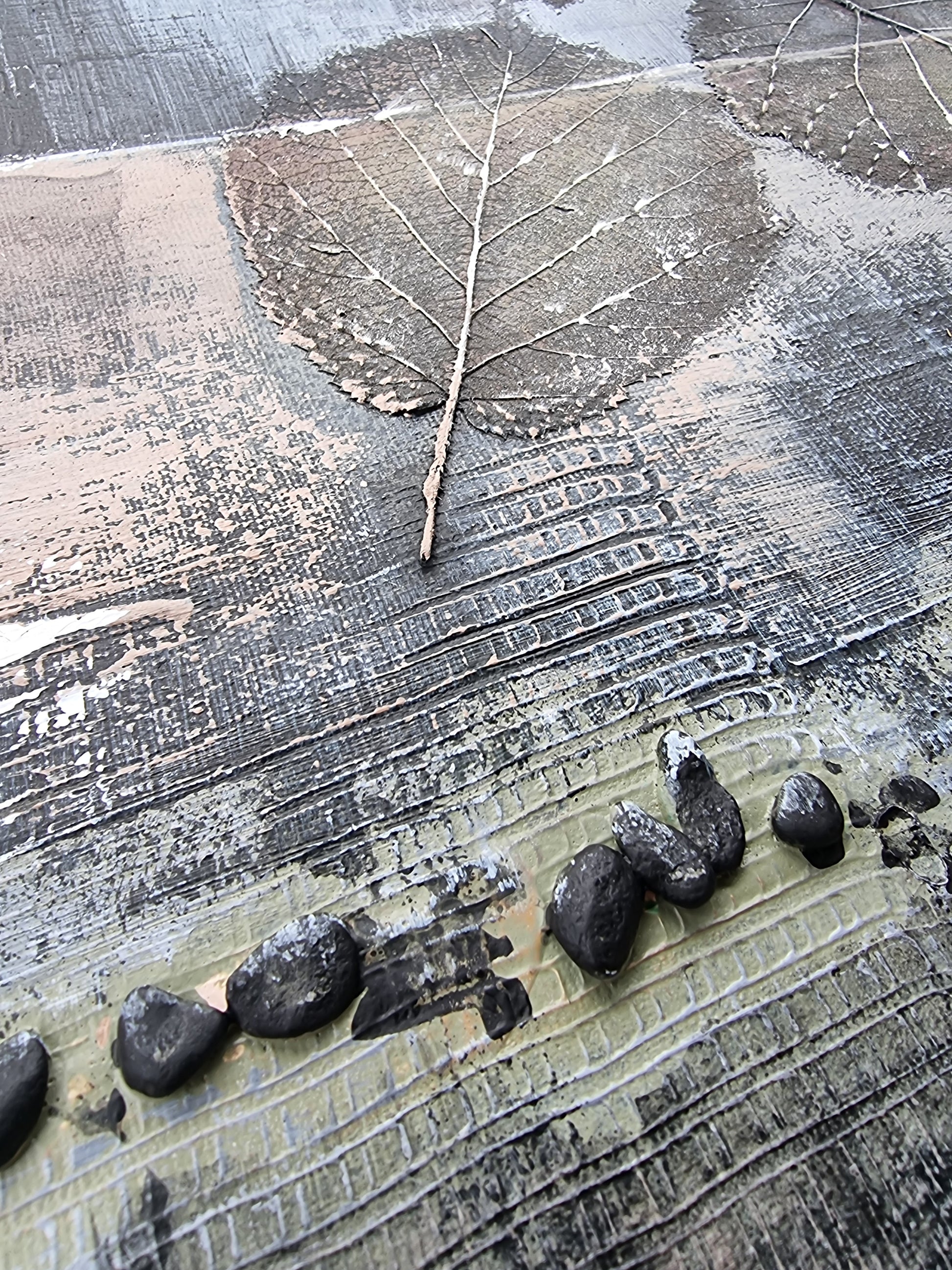 Akrils /sausas lapas, akmeņi / audekls uz apakšrāmja.